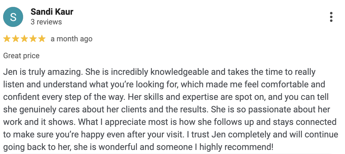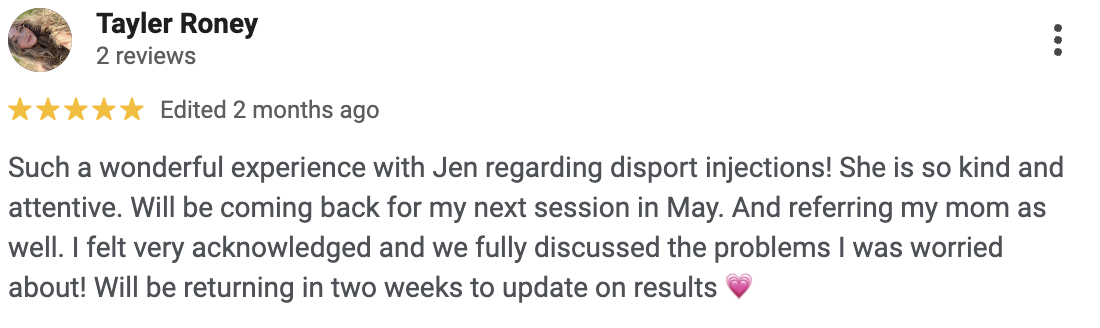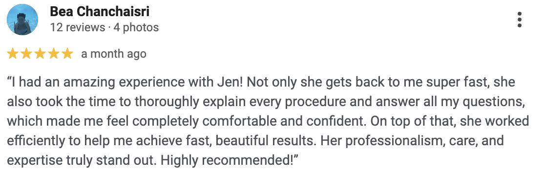 Hi, I’m Jen! I’m a nurse with a background in Pediatric and Adult Burn ICU care and a passion for aesthetic medicine. I love blending the science of nursing with the art of aesthetics to help patients feel refreshed, confident, and cared for. My goal is always to create a safe, comfortable, and positive experience. Outside of work, I enjoy all things fashion and beauty, spending time with family and friends, and life as a dog mom to my two pups.